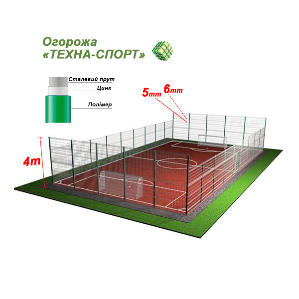 Система ТЕХНА Спорт використовується для огорожі футбольних полів, баскетбольних майданчиків, майданчиків мультифункционального призначення тощо. Складається з: