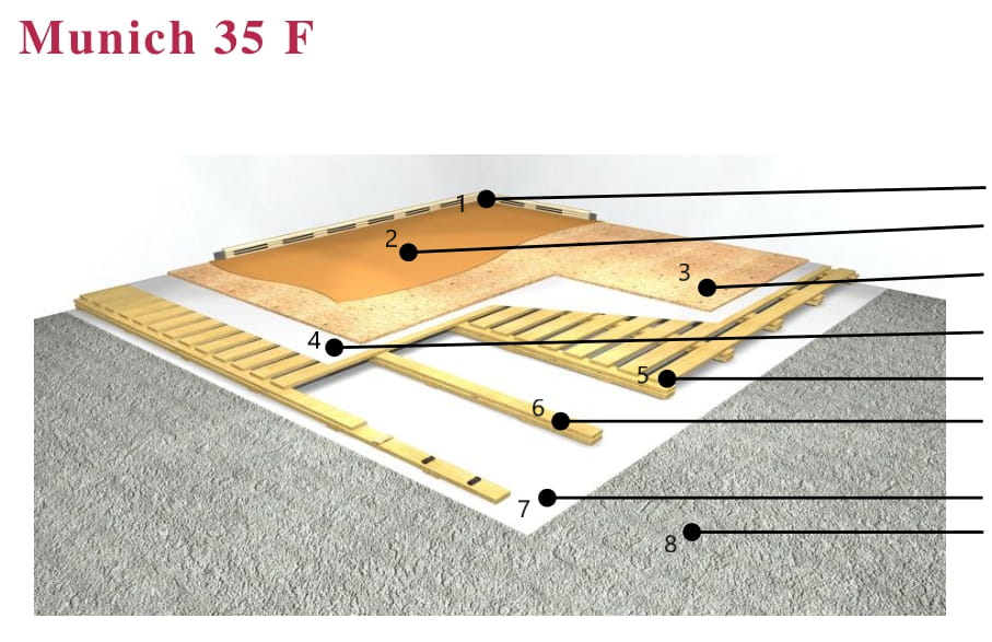 Система MUNICH доступна в двох варіантах: 35F і 50F. Модель Munich 35F - це так звана "пружинна підлога". Її можна монтувати на сирий бетон, навіть якщо підлога не ідеально рівна, оскільки нерівні частини можна вирівняти за допомогою вирівнюючих підкладок.
