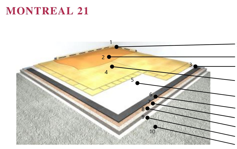 Висота конструкції моделі Montreal 21 складає всього 39 мм, а тому це - ідеальний вибір для проектів з реконструкції чи відновлення. Montreal 21 повністю відповідає вимогам німецького стандарту DIN V 18032-2; April 2001., EN 14904 та підлягає контролю якості RAL GZ 942. Коли необхідний швидкий монтаж та висока продуктивність, модель Montreal ідеальний для цього вибір. Основні роботи з монтажу - найбільш трудомістка складова частина - вже були зроблені на заводі HARO. Модель MONTREAL 21 складається з двох компонентів - еластичного шару HARO та модулів розподілу навантаження HARO з фанери найвищої якості. Модулі розподілу навантаження з фанери є преміальним рішенням у відповідності до найвищих вимог з якості, що забезпечує чудові навантажувальні можливості для багатоцільового використання та чудову продуктивність.